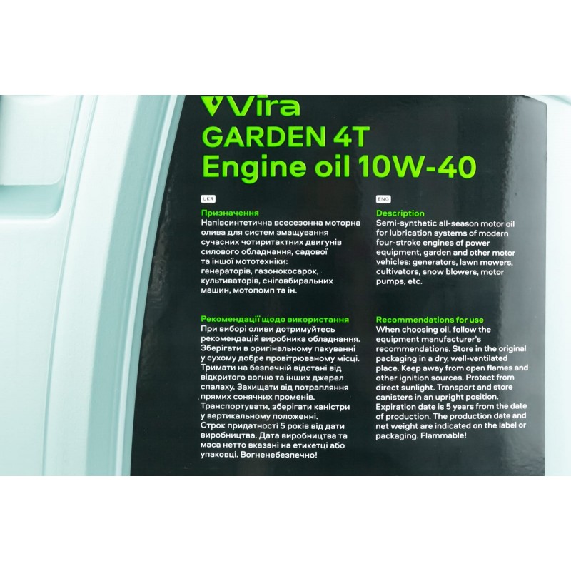 Масло 4T 10W-40 полусинтетическое для садовой техники, генераторов "GARDEN A3/B3 CE/SG", 4,5L Vira