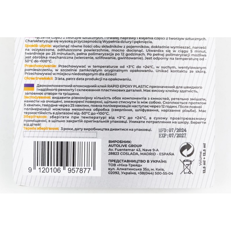 Клей двухкомпонентный для пластиковых деталей "EPOXY-PLASTIC", 30g AUTOLIVE