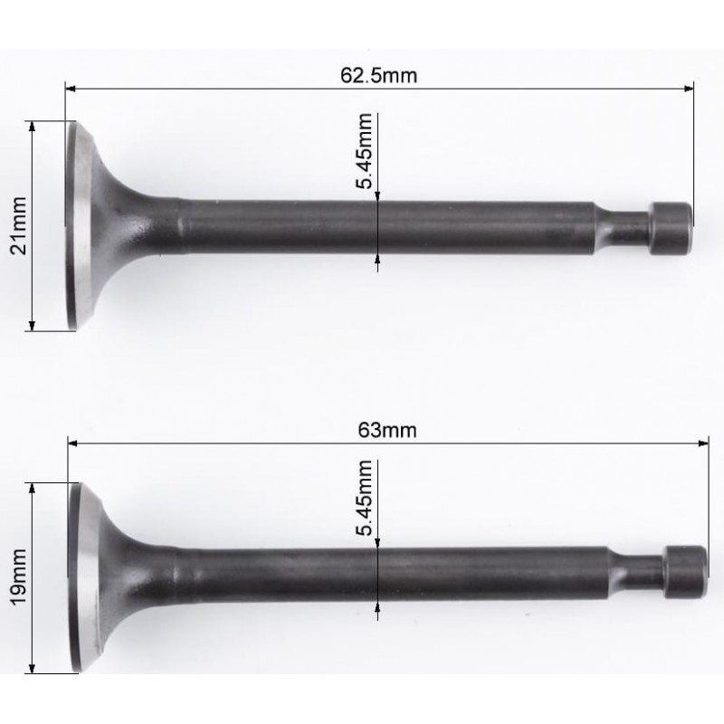 Клапани впускний (H-62,5/ D-21/ d-5,45), випускний (H-63/ D-19/ d-5,45) к-кт 2шт 156F/1P65F Китай