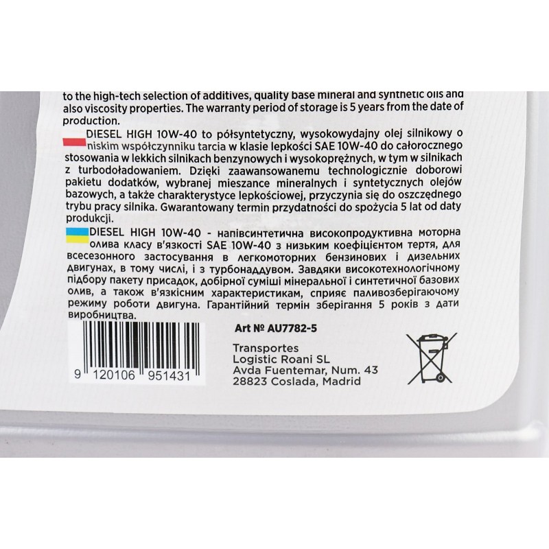 Масло 4T 10W-40 полусинтетическое универсальное "DIESEL HIGH", 5L AUTOLIVE