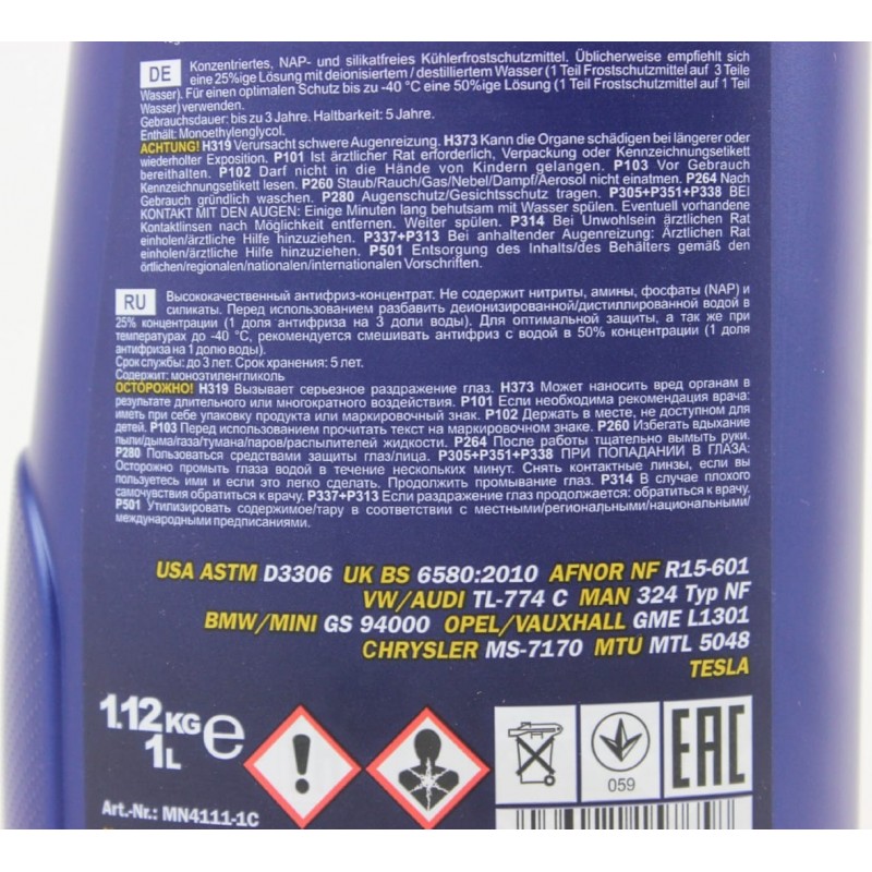 Рідина охолоджуюча концентрат -38°C 1:1 "АНТИФРИЗ AG11" блакитний, 1L MANNOL