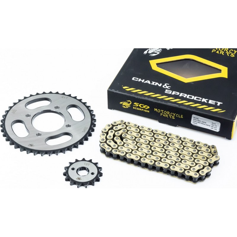 Зірки, ланцюг к-кт ZS125J, 428-118L+41T+15T "гартований", ланцюг GOLD (у коробці) Scorpion